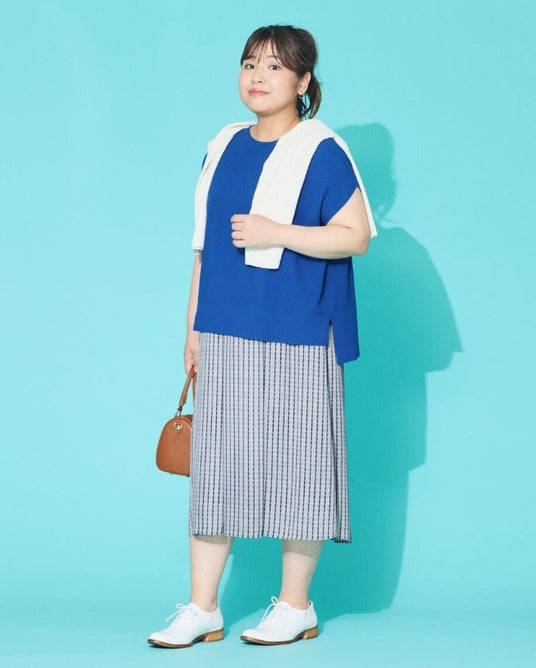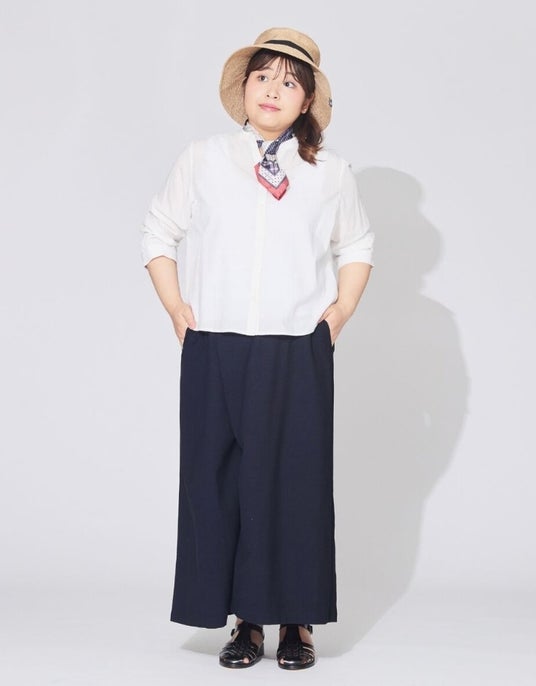 軽やかな素材感と涼しげなカラーを取り入れて初夏のお出かけをもっと楽しく。ほどよいリラックス感と上品さを兼ね備えたスタイルをプラスサイズモデル吉野なおさんが着こなします。