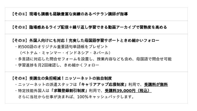 この度、介護福祉士資格取得によるキャリアアップの支援強化を目的に、日本人・外国人いずれの受講生にも対応できる内容へ再構築し、オンデマンド配信の講座から、ライブ配信+動画アーカイブの講座へと全面リニューアルしました。リニューアルを記念し、キャンペーン価格でのご提供となります。なお、ニッソーネットの派遣スタッフは「キャリアアップ応援制度」を利用することで受講料が無料となります。また、特定技能外国人は当社の「求職登録割引制度」を利用することで受講料が割引になります。