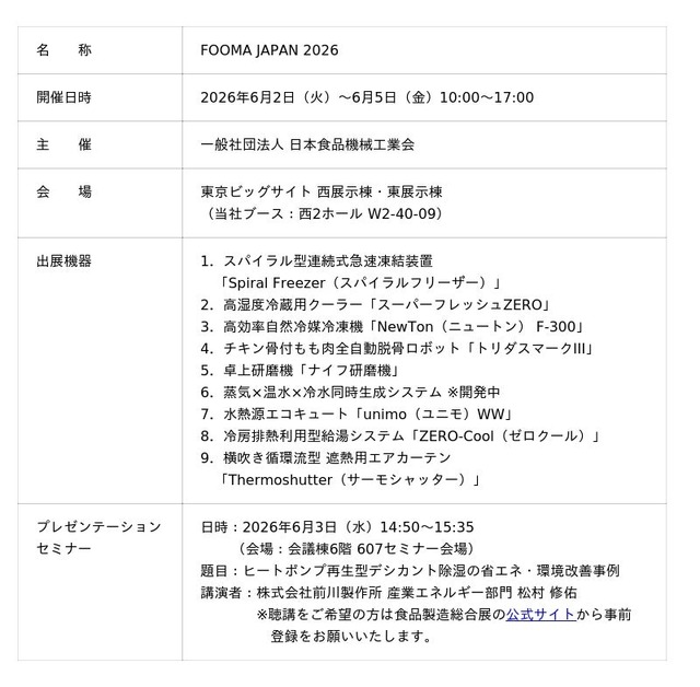 世界シェア40%以上(※1)を誇る産業用冷凍機をはじめ、各種産業機械の製造・販売ならびにプラントの設計・施工を手がける株式会社前川製作所(本社:東京都江東区、代表取締役 社長執行役員:前川 真、以下「当社」)は、2026年6月2日(火)~6月5日(金)に東京ビッグサイト(西展示棟・東展示棟)で開催される「FOOMA JAPAN 2026(食品製造総合展)」に出展いたします。