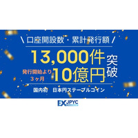 発行・償還プラットフォーム「JPYC EX」の累計口座開設数が13,000件、累計発行額が10億円を突破