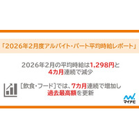 2026年2月の平均時給は1,298円と4カ月連続で減少。[飲食・フード]では、7カ月連続で増加し、過去最高額…