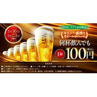 LINE・アプリ会員限定【3月16日、3月23日】マンデー\生ビール1杯100円セール/を開催!