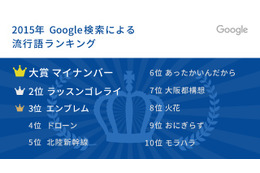 今年話題となった言葉に贈られる「2015ユーキャン新語・流行語大賞」が1日に発表。「爆買い」「トリプルスリー」の2語が大賞となった。これに先駆け、Google Japanが「Google検索による流行語ランキング」を同日に発表した。