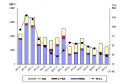 対前年同月比マイナス幅が徐々に縮小か、民生電子機器国内出荷実績……JEITA調べ