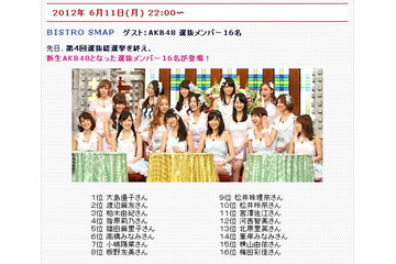 今夜の「SMAP×SMAP」にAKB48新選抜メンバー勢ぞろい、ぶっちゃけトークも!?